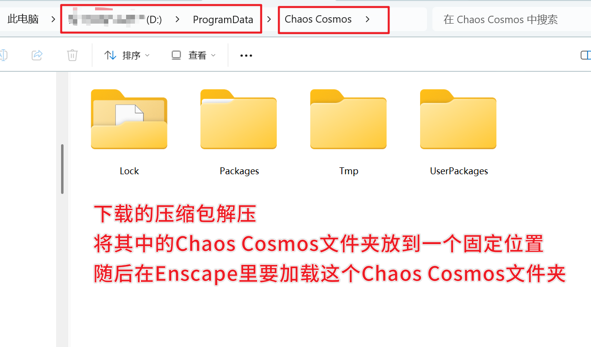 2、压缩后得到下载 Chaos Cosmos 文件夹,将这个文件夹放到一个位置,比如D盘